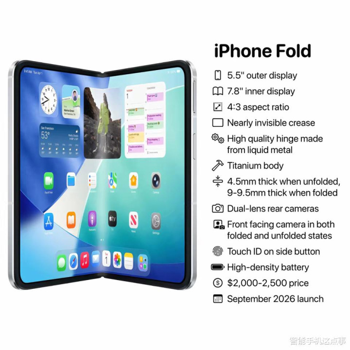 硬件配置方面悬念不大,据市场消息称,iPhone Fold或将搭载苹果最新的A20系列芯片(如A20 Pro),配合8GB或12GB LPDDR6内存和最高1TB的UFS 4.0存储。