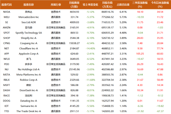 减持方面则覆盖较广,前二十大重仓均被不同程度减持,包含英伟达、亚马逊、拼多多等,一定程度上体现了组合再平衡与阶段获利的考量。