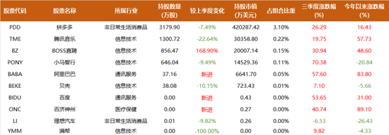 持仓中仍然保留有腾讯音乐、小马智行、贝壳及理想汽车等中概股。