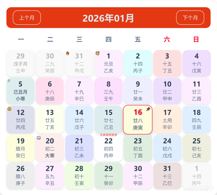 公历日期:2026年1月16日 星期五 ♑摩羯座农历日期:二〇二五年冬月廿八 ♀金曜日干支纪年:乙巳年 🌷木蛇🐍 纳音:覆灯火干支纪月:己丑月 🏠土牛🐮 纳音:霹雳火干支纪日:庚寅日 ⚔️金虎🐯 纳音:松柏木纪念节日: